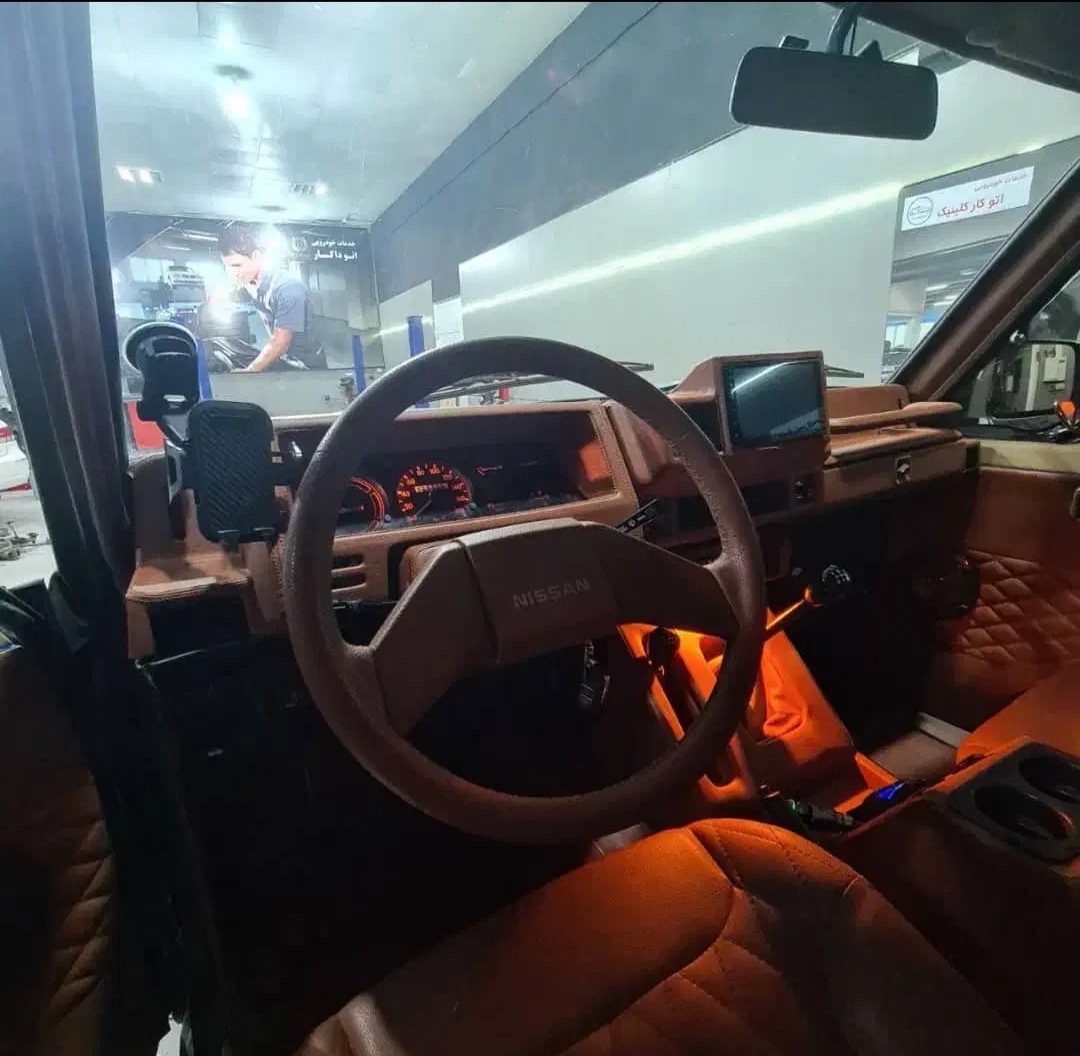 داخل ماشین شامل سقف و ستون ، صندلی ، داشبورد و فرمان کاملا چرم مارون شده